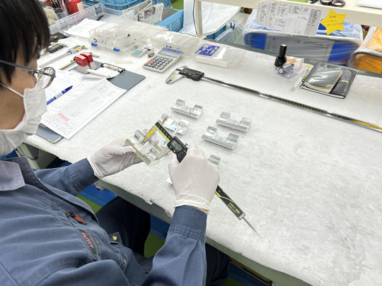 慣れてきたら少しずつ複雑な業務にも挑戦!コツモク作業ですがずっと同じ作業をするわけではなく、最初はマシンに金属をセットしてスイッチを押すだけでOK!あとは機械が作りたい部品の形に金属を削ってくれますよ ◎部品ができたら、機械から取り出して次の金属をセットしてスイッチを押して…と同じ作業を繰り返していきます。 出来上がった部品はヤスリでバリ取り後、検査部署にて機械で検査したのち梱包されていきます。 経験を積めば高い技術を身につけることができます。 |
